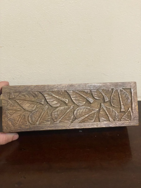 • Caixa de madeira porta incensos produzida na Índia, talhada à mão, com delicadas imagens de folhas de árvores esculpidas na madeira. Peça artesanal rica em detalhes, ideal para uso funcional ou como item decorativo de estilo étnico e natural. Qualquer duvida entrar em contato pelo whatsapp: 11932480666. OBS: A sua participação em nosso leilão ajuda em causas animais.