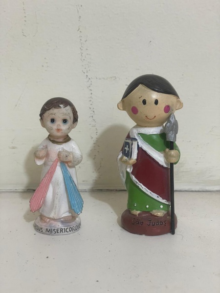 • Conjunto com duas pequenas esculturas religiosas em resina. Uma representa o Menino Jesus, com a inscrição Jesus Misericordioso, apresentando leve avaria na ponta da mão. A outra representa São Judas, em perfeito estado de conservação. Peças ideais para devoção, coleção ou decoração de oratório.Qualquer dúvida entrar em contato pelo WhatsApp: 11932480666.OBS: A sua participação em nosso leilão ajuda em causas animais.