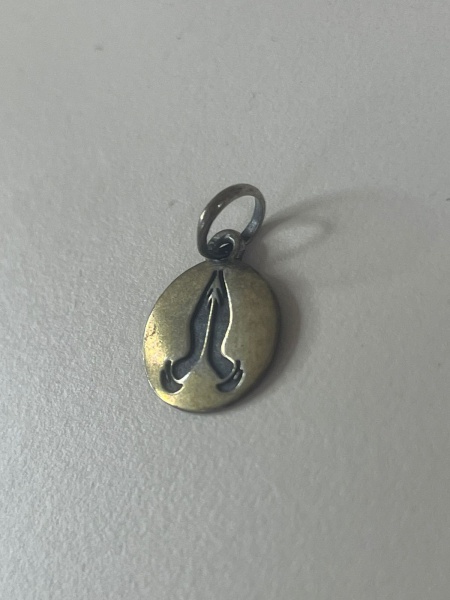 • Pequeno pingente confeccionado em prata 925, representando duas mãos rezando.Peça delicada e simbólica, com forte valor espiritual e acabamento refinado, ideal para uso pessoal, presente ou coleção.Qualquer dúvida entrar em contato pelo WhatsApp: 11932480666.OBS: A sua participação em nosso leilão ajuda em causas animais.